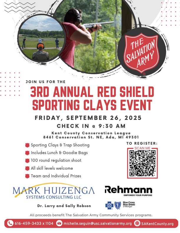 3rd Annual Red Shield Sporting Clays Event Sporting Clays & Trap Shooting Includes Lunch & Goodie Bags 100 round regulation shoot All skill levels welcome Team and Individual Prizes To sign up please visit their event HERE To see more information: https://kccl.org/wp-content/uploads/2025/07/2025-Red-Shield-Clay-Event-FLYER.pdf